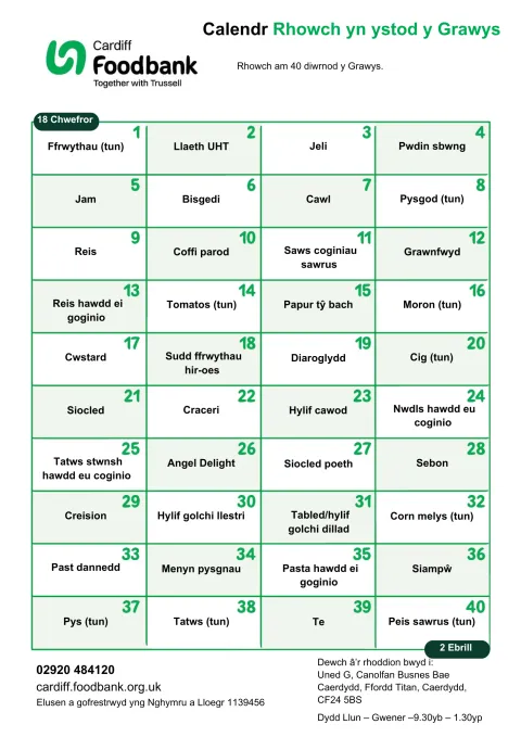 NewsShowing 8 of 8ArticleGet our 'Give in Lent' calendar 12 Feb 2026Find out how to download our Give in Lent CalendarNews articleTurning hardship into hope: Michael’s food bank story 16 Dec 2025Michael’s life has taken him from needing a food parcel to becoming a source of support for countless others.Food banksNews articleChristmas and New Year opening times 11 Dec 2025Cardiff Foodbank Christmas and New Year opening timesArticleC.A.N at Senedd for manifesto launch 08 Dec 2025In December, Trussell launched its Senedd election manifesto for 2026. News articleAdd your voice to our Cost of the School Day Campaign 04 Dec 2025 Written by Suzanne MorrowAdd your voice to our cost of the School Day CampaignPress releaseCanada Road Advent Windows Project lights up for Cardiff Foodbank 03 Dec 2025 Written by Suzanne MorrowCanada Road Advent Windows Project lights up to support Cardiff Foodbank News articleCardiff Foodbank launches Winter Cash Appeal 24 Nov 2025 Written by Suzanne MorrowCardiff Foodbank launches Winter Cash AppealFood banksArticlePre-register to run the Cardiff Half 2026 for us 15 Oct 2025Pre-register your interest in running for us in the 2026 Cardiff Half 1